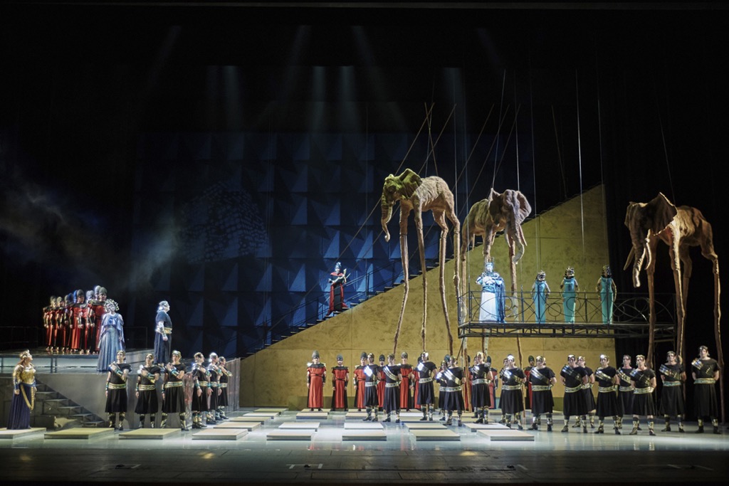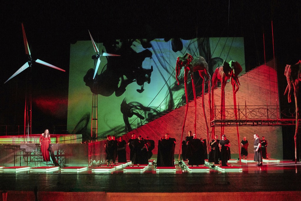 Чувственный мелодизм музыки Верди настолько самодостаточен, настолько глубоко и мощно проникает в сознание публики, буквально визуализируя все перипетии драмы, что три длинноногих слона в эстетике сюрреализма Сальвадора Дали, тельца которых, что букашки, застыли практически под колосниками сцены, ассоциируются с тем абстрактным треножником оперы о двенадцати опорах, вокруг которого и вращается ирреальное пространство театра. В нём в игру по ходу дела вовлекаются даже энергетические ветряки, но и без «подогрева» кипят живые человеческие страсти. Парадоксально, но мизансцены – едва ли не чистая классика, хотя и без помпезности: абсолютная статика показана даже сцене триумфа без полагающихся согласно классике оперного жанра «настоящих» слонов.