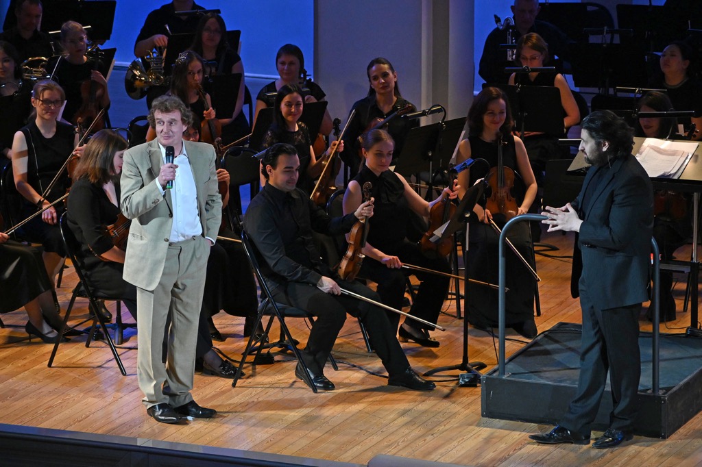 И всё же предложенная затем пьеса для симфонического оркестра «Молитва клоуна» границы жанровой эксцентричности уверенно перешагнула, явив психологически сложное и глубоко философское программное полотно, созданное четверть века назад, но впервые прозвучавшее только сейчас. Тройка вокально-оркестровых жанровых зарисовок предстала затем импровизированным «циклом» костюмированных мини-спектаклей. И первый в их череде – «Ошибка» на слова Саши Чёрного в исполнении Владимира Огнева. Второй – «Песня Черепахи» из мюзикла «Зверское шоу» в исполнении Михаила Агафонова. Третий мини-спектакль – «Вчера у Королевы» на слова Юнны Мориц из музыки к мультфильму (музыкальному альбому) «Праздник для слонов» в исполнении Галины Петкевич.