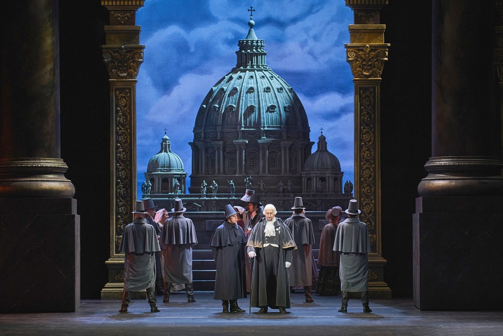 То был 10-й со дня премьеры показ «римской оперы» Пуччини. «Тоска» – двухчасовой трехактный концентрат человеческой драмы, где кипят уже не древнеегипетские – вовсе не «античные»! – страсти. Кровавую драму внутри классического любовного треугольника «Каварадосси – Тоска – Скарпиа» с явно злодейской вершиной Иркин Габитов (режиссер), Вячеслав Окунев (сценограф и художник по костюмам) и Александр Кибиткин (художник по свету) помещают в монументально-помпезную декорацию Вечного города в каждой из его сюжетных локализаций. Классика мощно проступает во всём: в живописном декоре и архитектурном правдоподобии эпохи наполеоновских войн, в исторических костюмах и мизансценах. Вторя этому, совершенная классика царит и в оркестровом аккомпанементе, и в вокально-актерской линии, которую мастерски проводит тройка главных персонажей.