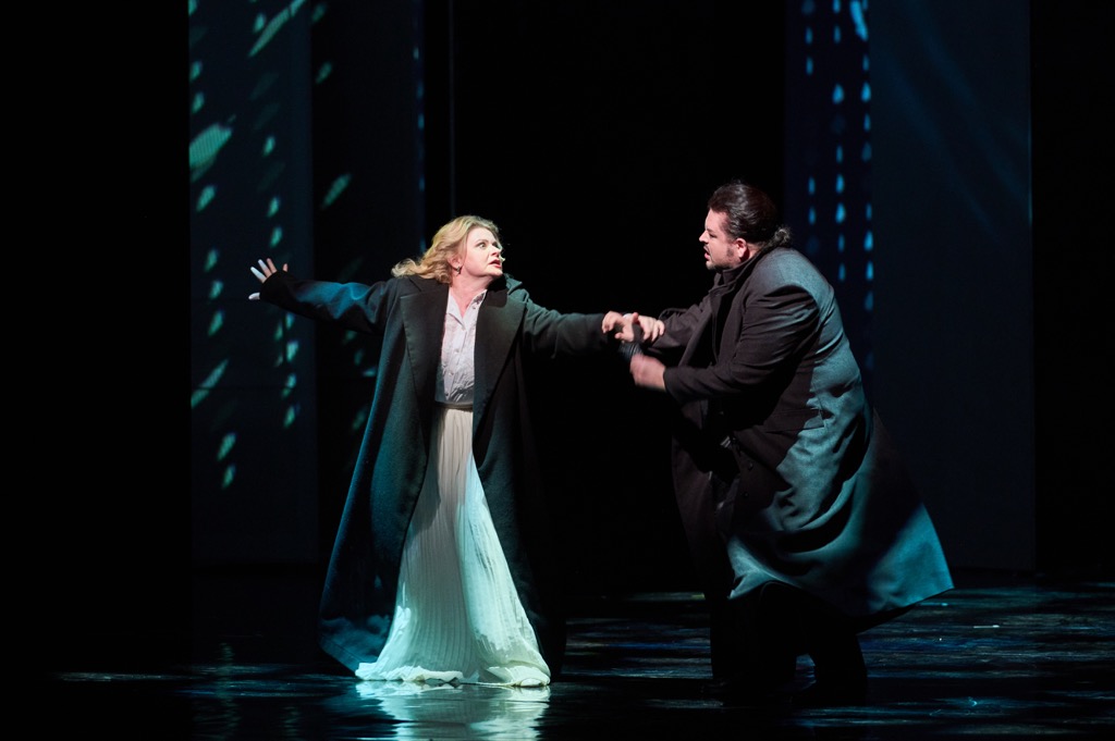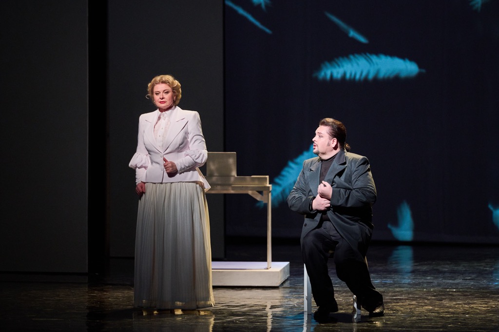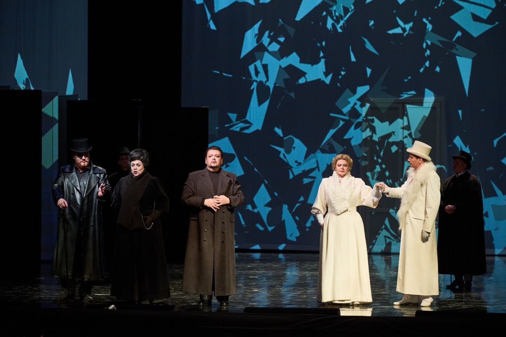 В нынешней игре всего две «масти» – черная и белая, хотя на видеопроекционных экранах мы видим всю карточную палитру. Графиня и Лиза – противоположные сущности черного и белого, словно дублет дамы на игровой стороне карты. Носители белой масти – Лиза, ее подруга Полина и Князь Елецкий (персонаж, проработанный в либретто менее всего). Носители черной масти – Графиня, Герман и Граф Томский, не считая Сурина и Чекалинского, образующих с Томским искушающую Германа явно не святую троицу. Черная масть довлеет надо всем, и белое исподнее, в котором и Графиня, и Герман отходят в вечность, в заблуждение вводить не должно: это всего лишь цвет погребального савана.
