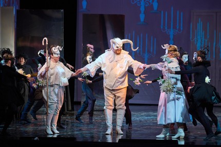 Разрешить целый комплекс поставленных режиссером задач стало возможно благодаря команде, в которую вошли Мария Смолко (сценограф и художник по костюмам), Михаил Смолко (художник видеоконтента), Нелли Сватова (художник по свету), а также Андрей Меркурьев (хореограф). Заметим, что за исключением сцены с детьми в Летнем саду в сáмом начале оперы, целостность оригинальной партитуры, включая вставную по своей сущности пастораль, в этой постановке сохранена. При этом и хореография пасторали, и прочие пластические решения органически подчинены режиссерскому замыслу.