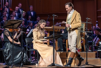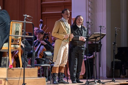 При этом этнический фон происходящих событий в опере усилен, а сама опера после небольшой «созерцательной» прелюдии начинается «сразу» – без какого-либо предисловия – развернутой хоровой сценой студенческого праздника, который привлекает названную тройку героев и на котором, собственно, и происходит их встреча. В первом акте эпизодическую партию Сениора (главы корпорации студентов) не слишком впечатляя, но вполне зачетно проводит тенор Илья Легатов. В небольшом загородном саду с пивным буфетом и столиками для посетителей в центре второго акта – большая хоровая сцена с эффектным куплетным номером – песней Старого бурша. И с этим мощным хитом зычный и мощный бас Михаил Гужов, что называется, кладет зрительный зал на обе лопатки!