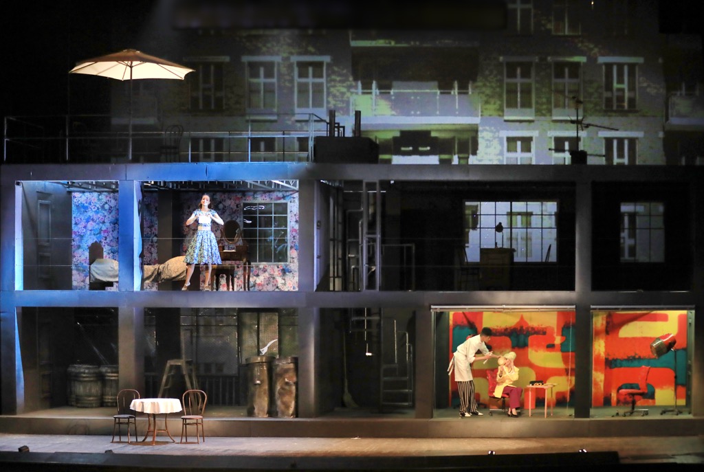 Вся эта монолитная конструкция, за которой с помощью подъемного панно Севилья открывается, словно с высоты птичьего полета, выстроена практически вплотную к рампе. Так что всё действо внутри ячеек сценографической матрицы и фронтальные эпизоды на авансцене вполне успешно – в отсутствии эффекта глубины театральной сцены – создают иллюзию большого «плоского экрана». А кино начинается еще с увертюры при закрытом занавесе, когда проекции испанских титров на насыщенно красном фоне (так уж совпало, что для броской эстетики Альмодовара это знаковый цвет!) представляют постановщиков и персонажей «киноспектакля», кооптируя в их число и знаменитого испанского мэтра.