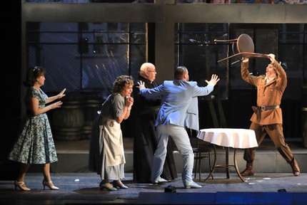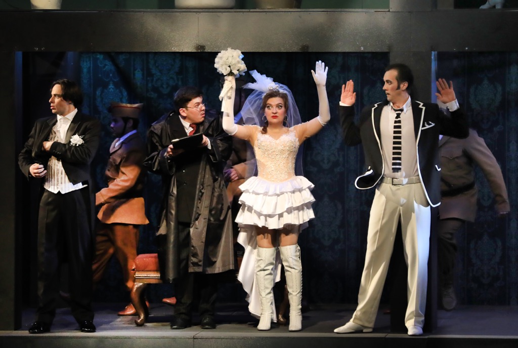 Опера Россини – итальянский сплав французской классической пьесы, весьма знойной испанской – по месту локализации сюжета – атмосферы и музыкального стиля бельканто, овеянного особой искрометной аурой «упоительного Россини». И на этот раз в Ростове постановочный триумвират в составе художественного руководителя проекта Вячеслава Кущёва, режиссера Георгия Исаакяна и художника (сценографа и дизайнера костюмов) Вячеслава Окунева, держа генетическую «итальянскость» опуса, что называется, в уме, и ни малейшего ущерба ей не причиняя, отталкивается именно от «испанскости». На сей раз «испанскость» привлекает постановщиков не в глобальном плане, а в эстетике знаменитого испанского кинорежиссера Педро Альмодóвара, чьи фильмы давно уже стали признанной классикой XX и XXI веков, и сама идея такого подхода приносит лишь позитивные плоды!