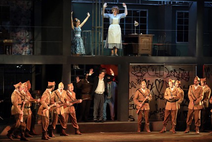 Бережно сохраняя оригинал истории, заложенной в либретто Стербини и обретшей чарующий язык в щедрой мелодике Россини, режиссер выстраивает свой многоэтажный в сценографическом и многоуровневый в психологическом плане спектакль на абсолютной классике мизансцен с традиционными комедийными гэгами. Их всегда так ждет широкая публика, и лиши её любимого развлечения, она вряд ли это поймет! Однако на этот раз широкая публика поняла постановщиков превосходно, и эффект разорвавшейся бомбы спектакль как раз и производит в силу традиционности, заключенной в инновационную оболочку с кинематографическим подтекстом. В каждом из двух актов оперы сценограф создает двухэтажную – лишь с небольшими функциональными вариациями – матрицу, а ее третий уровень – балкон-терраса, без чего сюжетную коллизию оперы не разрешить никак.