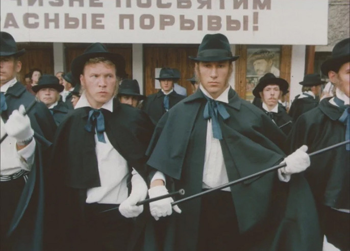 Этот вид самозащиты использовали когда-то британские денди, и — русские тоже. Пушкин был не только бретёром, но и мог…пододвинуть наглеца своей изящной, но увесистой тросточкой. Так Виктор становится главарём боевой группы, наряженной в стиле романтизма — белые рубахи, шляпы и — бакенбарды. (К слову, в «Заводном апельсине» мы видим тот же вариант — хулиганы-меломаны-эстеты носят котелки и — мутузят прохожих тростями, а Энтони Бёрджесс задумал сюжет после того, как побывал…в Ленинграде).
