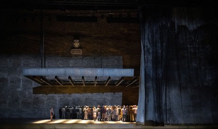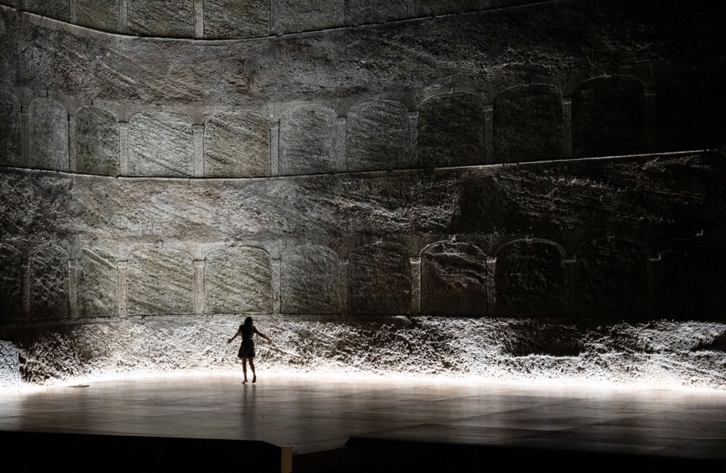 На первый взгляд, постановка лишена сценографии, но сплошная стена Скальной школы верховой езды (Felsenreitschule) с арками, замурованными ещё в 2018 г. для «Саломеи» Кастеллуччи, используется режиссёром в качестве символа безвоздушного пространства ролевой ритуальности: сын должен подчиняться властной матери, работник – хозяину, жена – мужу, и совершенно неважно, действительно ли эти формочки приличий наполнены живым содержанием. Борис формально подчиняется Дикому, Дикой формально подчиняется Кабанихе, Кабанихе же вяло подчиняется Тихон, и только Катерина — чужая в этом социальном марионеточном вертепе.