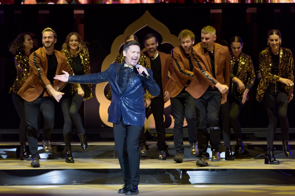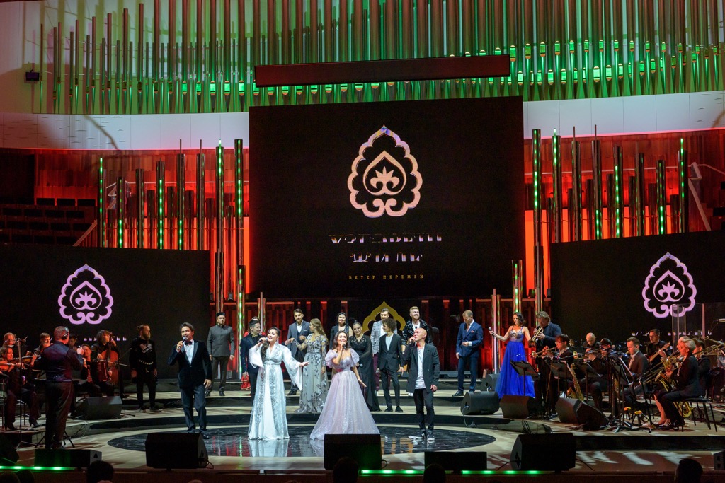 Благодаря гастрольному вояжу, случившемуся в МКЗ «Зарядье» 13 сентября этого года в качестве постсобытия Дней культуры Республики Татарстан в Москве (21–25.08.2022), приобщиться к проекту довелось и автору этих строк. Но парадокс – не впервые, хотя и в первый раз, так что немного терпения. В данном случае в Москве речь идет о постановке грандиозного песенного шоу, драматургия которого прослеживается (если прослеживается вообще) весьма и весьма условно. Однако большое концертное шоу с типично эстрадными высокотехнологичными атрибутами – с огромными проекционными экранами и эффектами мощной 3D-графики, с «неоновыми огнями» и подтанцовками миманса, с опциональным бэк-вокалом и «дефиле» национального костюма – и впрямь ведь захватывает!