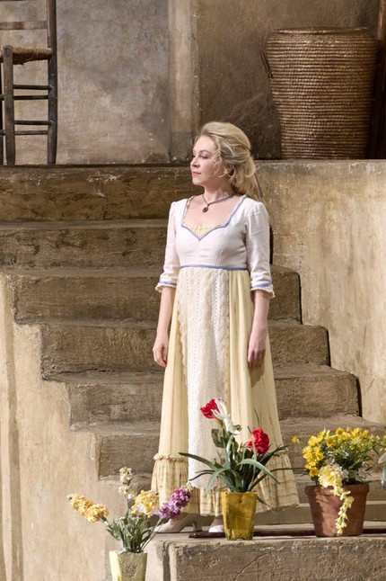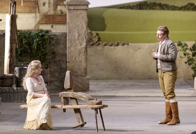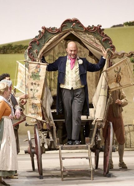 Эту партитуру в Венской опере поставил один из выдающихся мастеров реквизитного театра Отто Шенк: здесь и двор, залитый солнцем, и просторный светлый задник «во весь экран», и изумительные по гамме и крою классические костюмы, и глуповатые мизансцены в стиле комедии положений, — словом, прекрасно всё.