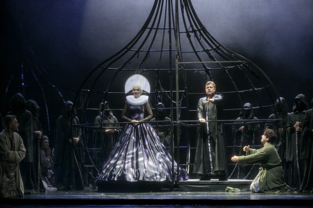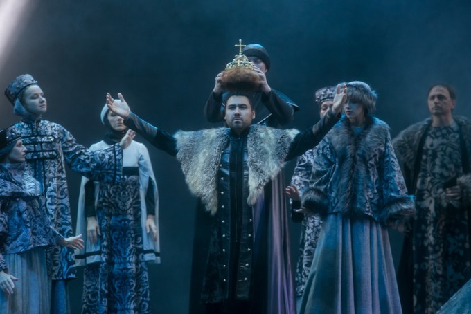 Ничего бытового в сценографии, скроенной по лекалу реалистической абстракции, на этот раз нет, а монументальная символичность «театрального ордера» на уровне яркого гротеска предстает с наложением эффектов видеопроекций на заднике и авансценическом суперзанавесе, так что постановка при ее многоплановости технологически инновационна. Мистика происходящего усилена в ней и мимическим присутствием ряда персонажей в тех сценах, где их де-факто нет и быть не может. В келье Чудова монастыря это «незримое» присутствие Бориса Годунова. В «Сокольниках на Днепре» это уже «реальное» присутствие Юродивого и выступающей единым фронтом с Самозванцем Марины Мнишек.