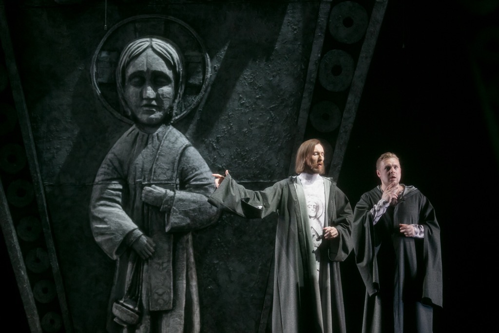 Последовательность 8-ми сцен-«кирпичиков» конструктора обсуждаемой постановки в соответствии с приведенной выше музыковедческой нумерацией законченных автором сцен такова: 1) – 2) – 3) – 10) – 7) – 11) – 12) – 13). То есть нынешняя постановка – еще один конструктор, имеющий полное право на существование в прицеле тех режиссерских задач, что в обсуждаемом спектакле решены блестяще! На исторической премьере в Мариинском театре 1874 года сцена в корчме, к примеру, была, но программной в данном случае сцены в келье, без чего нынешняя постановка просто немыслима, не было.