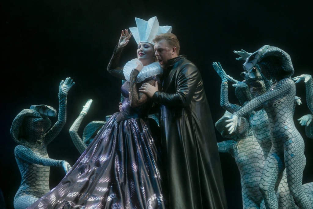 Две вокальные ипостаси – драмсопрановую и меццо-сопрановую – в партии Марины Мнишек соответственно в первый и второй день блестяще представили ведущие солистки театра Гюльнара Низамова и Наталья Бызеева. Партия коварной и расчетливой полячки, решенная и в сценографическом, и в костюмном отношениях в «змеиной» символике, стала одновременно и контрастом, и «родственной параллелью» к образу Самозванца, а именно в этой постановке, в которой сцена у фонтана впервые прозвучала в авторской оркестровке Мусоргского, стала одной из его музыкальных фишек, стала символом возвращения к его наследию, порядок в котором наводится лишь сейчас… Так что если вы потерялись в море редакций «Бориса Годунова», встречаемся в центре краснодарской постановки у фонтана!