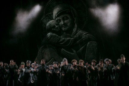Однако неоднозначность – лучшее, что можно придумать в ситуации с шитой белыми нитками историей Смутного времени, и после подобной впечатляюще мудрой хитрости режиссера-постановщика снова укрепляешься в мысли, что Борис Годунов невиновен. Как раз для того и надо было его «убрать», чтобы выгодную Романовым «тайну» оклеветанный царь навеки унес бы с собой в могилу! С блеска упомянутого выше кинжала собственно и начинается предсмертный монолог Бориса, истинного царя-праведника, а убранство сцены, ненадолго возвращавшее до этого к официозу гигантскими скипетром и державой из сцены венчания Бориса на царство, ожидаемо и закономерно сменяется барельефом Богородицы с Младенцем, что был символом первой картины – призвания Бориса Годунова на царство.