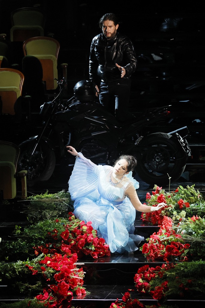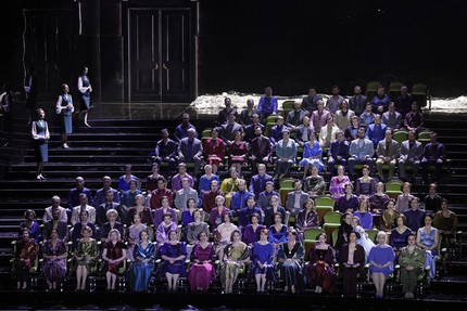 «Свадебно-похоронную» процессию, хотя вынос тела Синодала лишь подразумевается, но в реальности не происходит, берут на себя статисты с огромными букетами, суетящиеся практически в каждое мгновенье, но особенно усердствующие под музыку отсутствующих на сей раз праздничных – предполагавшихся по случаю свадьбы – танцев. Эту наивную «игру в бирюльки» режиссер явно подглядел в «фирменной» метóде Дмитрия Чернякова, когда музыка танцев сохраняется, но, как в его «Руслане» или «Садко», используется по назначению, решительно несовместному с элементарной логикой и здравым человеческим смыслом: разверзающаяся пропасть по-дилетантски огромна и непреодолима…