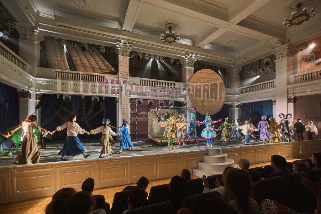 После капитальной реконструкции 2017 года Малый зал НОВАТа, служивший когда-то концертной площадкой, стал активно использоваться и для театральных проектов. И за это время «колонно-балконное» – в соответствии с архитектурным ордером оформления зала – пространство Малой сцены в отсутствие классических кулис, колосников и занавеса обживалось постановщиками с не повторявшейся каждый раз выдумкой! И поэтому стало совершенно ясно, что пределам освоения этой сцены поистине нет совершенства! Так, на сей раз в спектакле была реализована атмосфера призрачной киностудии, павильона для съемок, где приключениям Буратино, его друзей и врагов был дан зеленый свет театра.