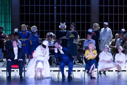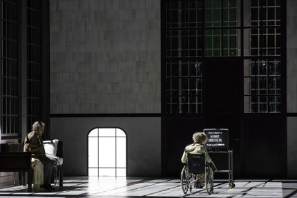 Исполнитель главной партии Людовик Тезье в спектакле Варликовски не только изумительно звучит, но и превращается в настоящего трагика. Мы видим оголённый образ израненного человека, поместившего самого себя в психушку, в которой по соседству находится и его мать-мужеубийца, состарившаяся и беспомощная, и в которой его посещают призраки прошлого в образе отца — сияющего белого клоуна.