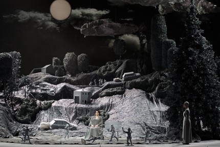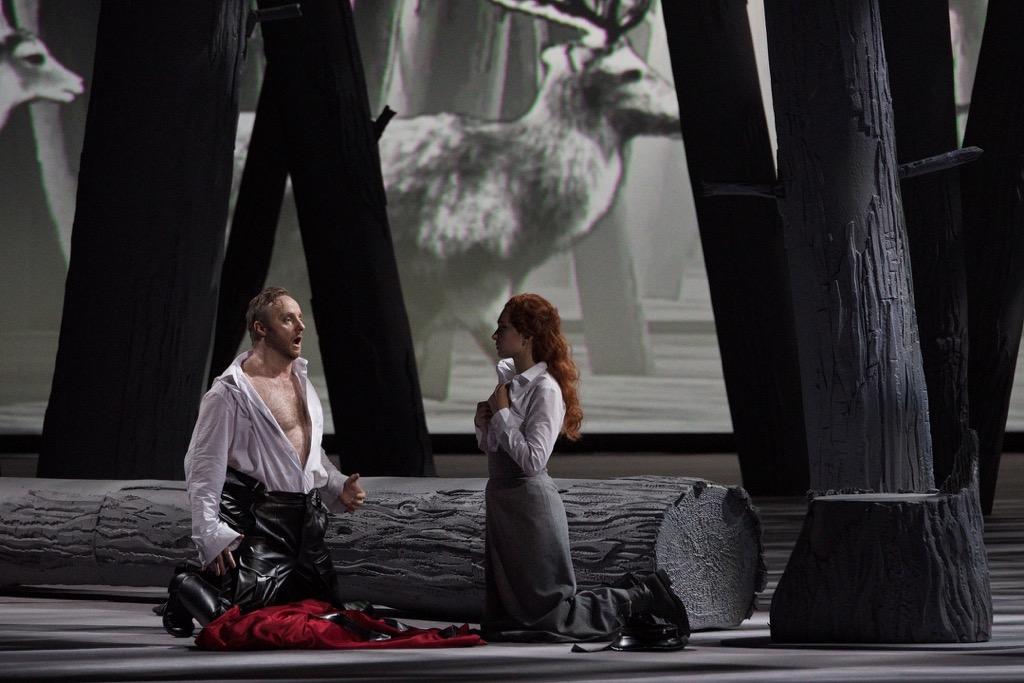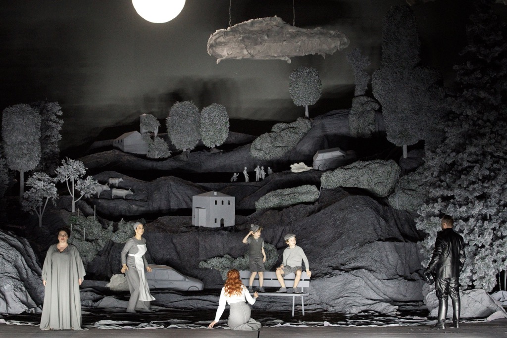 Это пространство наполнено духом мятежного воинского братства, таинственностью леса, отблесками лунного света и жизнеутверждающей символикой будто бы парящих по кронам деревьев благородных оленей. Сюжетные локализации этой оперы, в основном, – экстерьерные монументальные картины лесной чащи, и они весьма органично сочетаются и с интерьером жилища Нормы в стиле хай-тек, и с экстерьерными инсталляциями малой формы по типу рождественских вертепов. Мы смотрим изысканное черно-белое кино с большой палитрой оттенков серого, и отсутствие красочности словно говорит о жизненном бремени, о беспощадном роке, что выпал на долю друидов, ведь с открытием занавеса в первом акте Норма уже грешна, и от связи с Поллионом у нее прижиты двое тайных детей.