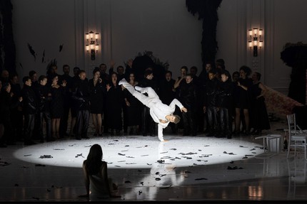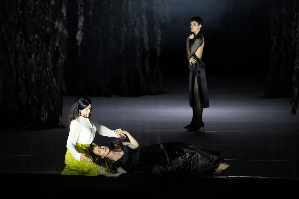 Черный дурманящий мир бессмертия, на которое позарилась Семела, возникает в спектакле чёрным птичьим пером, а силуэт гигантской вороной птицы преследует нас в роскошных видеоинсталляциях. Противостоять этому чудовищному обаянию вечности тем невозможнее, чем веселее оно само себя представляет.