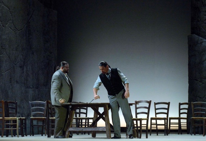 Это был один из тех редких случаев, когда режиссура в оперном театре произвела наиболее приятное впечатление: серо-пыльные тона сценографии и костюмов, выполненных Венецианской академией искусств, органично оттеняли грамотные режиссёрские решения (особенно финальный вынос трупа Туридду как мешка с мусором, который бросают на стол перед обомлевшей матерью) и пластические инсталляции хореографа Данило Рубеки. Вертикальные ширмы вращались, артисты перевоплощались, музыканты старались, хор звучал.
