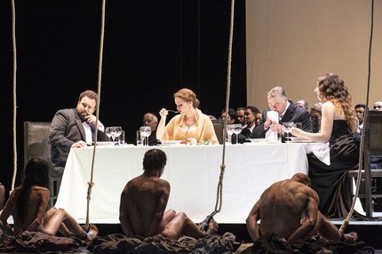 2) Партии приличных людей достались певцам, во всех смыслах экзотическим. Бразильская сопранистка Адриана Куейрос достойна звания феи-крёстной уже за то, как легко она превратила прекрасную королеву Елизавету Валуа в тётку Лизу Вуаля, а берлинскую Государственную оперу под липами – в кружок любительской мелодекламации. Технические возможности певицы не давали ей сносно попадать в не самые сложные ноты и выдерживать не самые трудные модуляции тесситуры, и за это надругательство над профессией Адриане Куэйрос на поклонах кричали «бу».