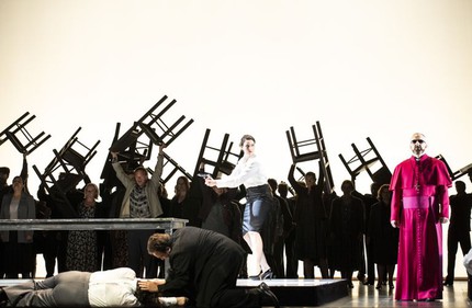 Но вообще ни во что не попадал выпущенный почти двадцать лет назад спектакль Филиппа Химмельмана в практически отсутствующей чёрно-белой сценографии Йоханнеса Лейакера и мрачно-невзрачных костюмах Клауса Брунса. Представленный под соусом гастрономически-эсэсовского гламура конфликт свободы и тоталитаризма идёт сегодня в Берлине при полупустом зале при цене на билеты в два раза меньшей обычной (первый ряд партера на «Дон Карлоса» предлагается за 80 евро вместо обычных 132). И не удивительно: сегодня содержание новостных блоков намного масштабнее и страшнее, чем игрушечные казни инакомыслящих и вымученные мизансцены с муляжами пистолетов, направленных в зрительный зал и обнажающих имбецильное мировосприятие постановщика [1].