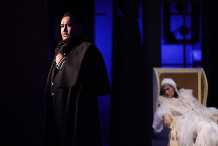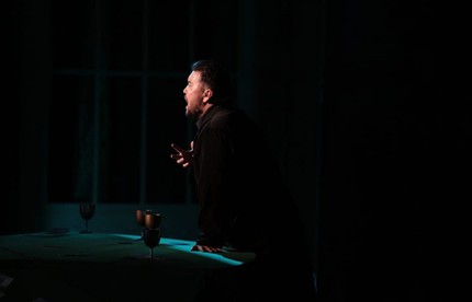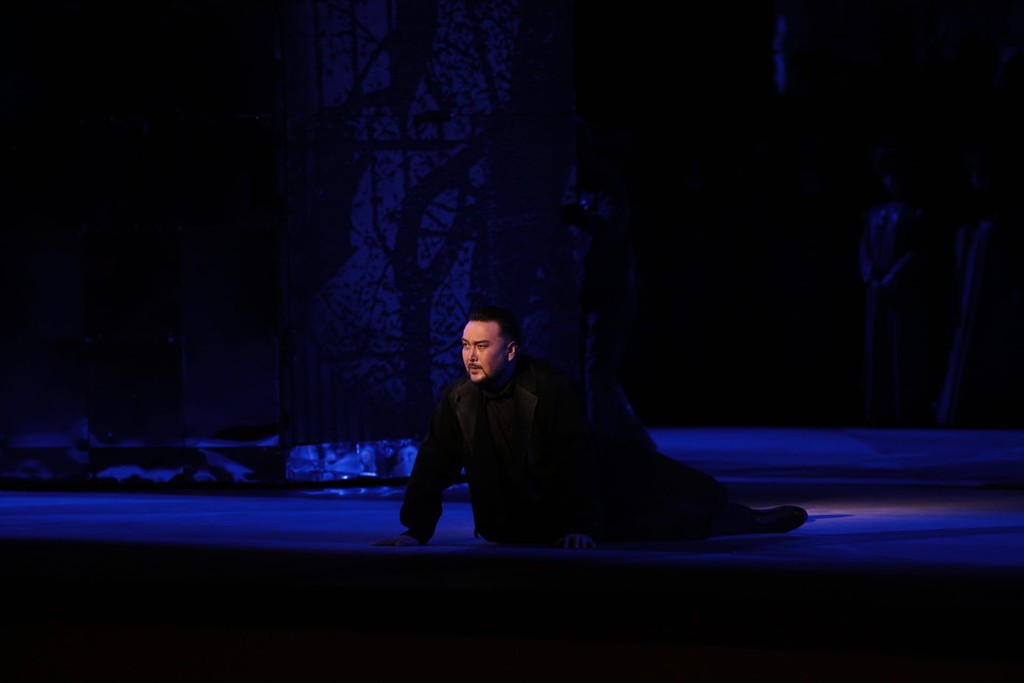 Но прежде чем говорить об этой работе певца, о работах выступивших вместе с ним в этот вечер коллег по сцене и работе дирижера, несколько слов скажем о самóй постановке. Команде во главе с Пламеном Карталовым в составе сценографа Александра Костюченко, художника костюмам Нины Гурло и художника по свету Ирины Вторниковой довольно скромными, мобильными, но действенными средствами удалось создать завораживающую иллюзию мистического пространства зеркал, теней и отражений. В этом иррациональном пространстве, подчиненном воплощению навязчивого наваждения Германа, всё движется сверхидеей карточной игры. Ставкой в ней де-факто становятся жизни трех персонажей – Лизы, Германа и Графини, фигура которой как раз и рождает всю карточную мистику.