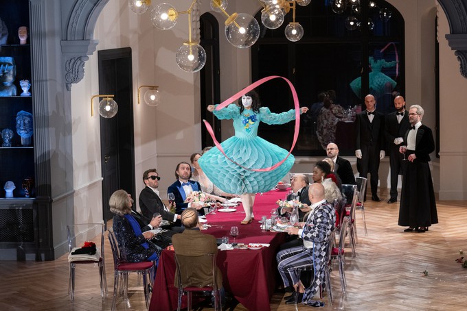 Поэтому не стоит удивляться, что любителей постановочных нелепостей не смутила и совершенно бестолковая интерпретация упомянутого выше танца Саломеи, которую Черняков-режиссёр превратил в демонстрацию ретро-модного «лука» [5] главной героини в балетной пачке-фонарике цвета Тиффани с розовой гимнастической лентой (такое цветовое сочетание действительно использовалось в рекламе ювелирных товаров торгового дома «Тиффани»). И думаю, вряд ли апологетов режиссёрской фривольности расстроила мизансцена, придуманная для финального монолога главной героини, в которой Саломея обращается к Иоканаану как к мёртвому, тогда как Иоканаан сидит и смотрит на неё, как на дуру (я почему-то не сомневаюсь, что именно так же смотрел бы на режиссёра и сам Рихард Штраус, окажись он в зрительном зале).