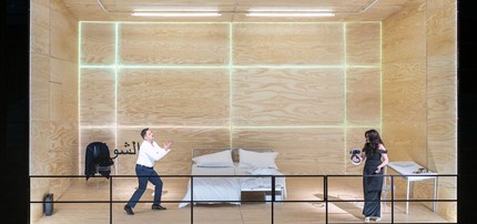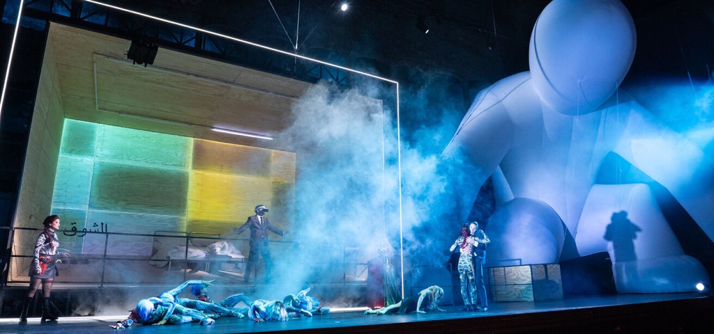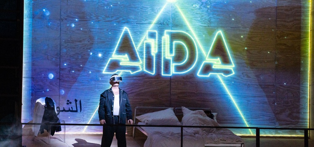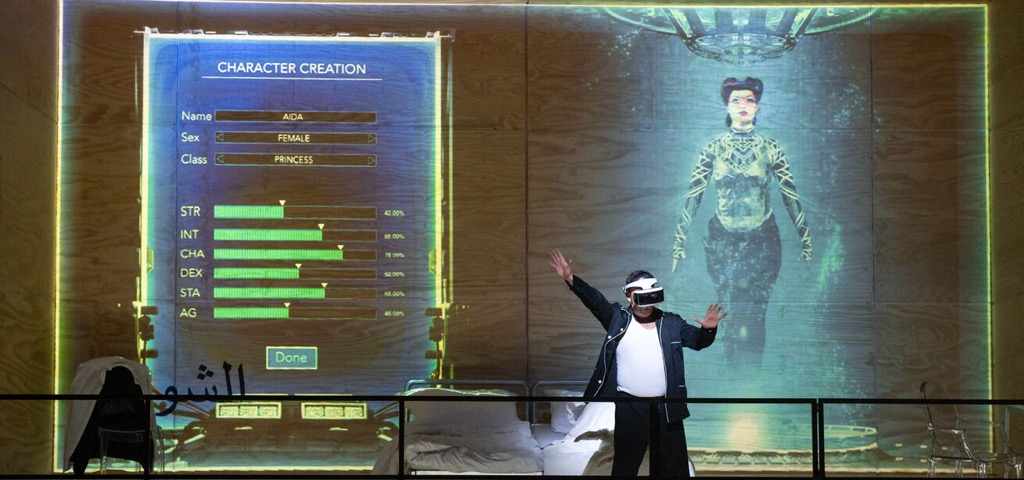 Новый спектакль режиссёра Андреаса Гергена по опере Джузеппе Верди «Аида» начинается с приготовления ко сну супружеской пары: красавица Амнерис прихорашивается, соблазнительно поглядывая на своего мужа Радамеса, который от неё отворачивается. Но как только супруга засыпает, Радамес выкрадывается из-под одеяла, лезет под кровать и достаёт оттуда… игровую приставку! На стене спальни появляется видеозаставка компьютерной игры «Аида», в которой Радамес моделирует свою идеальную женщину и дарит ей кольцо как символ вечной любви и преданности.