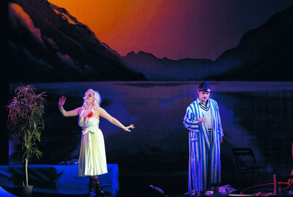 Не секрет, что сегодня буквально в каждой новой постановке используется либо приём театра в театре, либо кино в кино, либо игрового шоу на телевидении, либо всё вместе в одном месте. Углубляться в этой связи в режиссёрскую концепцию спектакля Аники Рутковски просто страшно: и здесь действие оперы Моцарта «Мнимая садовница» превращено в съёмки разных телепрограмм – от развлекательно-спортивных до судебно-познавательных. Принципиально это решение никаких возражений не вызывает: либретто «Мнимой садовницы» по глупости ничем не уступает современным развлекательным телешоу, и человек, интересующийся культурологией и историей развлекательных жанров, найдёт в таком прочтении немало пищи для ума.
