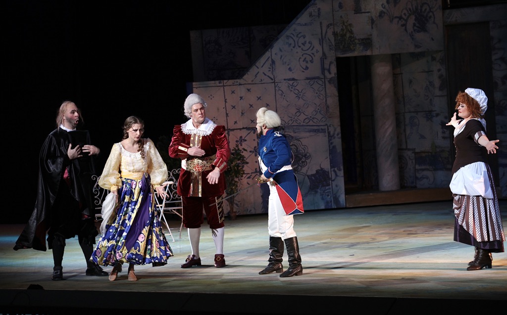 При этом нельзя не отметить профессионализм и музыкальную вдумчивость дирижера-постановщика Владимира Оводка, его изящную, стилистически органичную и деликатную работу в аспекте темпов и нюансировки. Хоровые страницы оперы, в которых фигурируют мужские голоса, востребованы лишь в каждом из двух финалов, и с хорами оказалось всё в полном порядке (хормейстер – Нина Ломанович). При этом в ансамблях, несмотря на всю несомненную дирижерскую деликатность и опытность, в порядке было не всё и не всегда.
