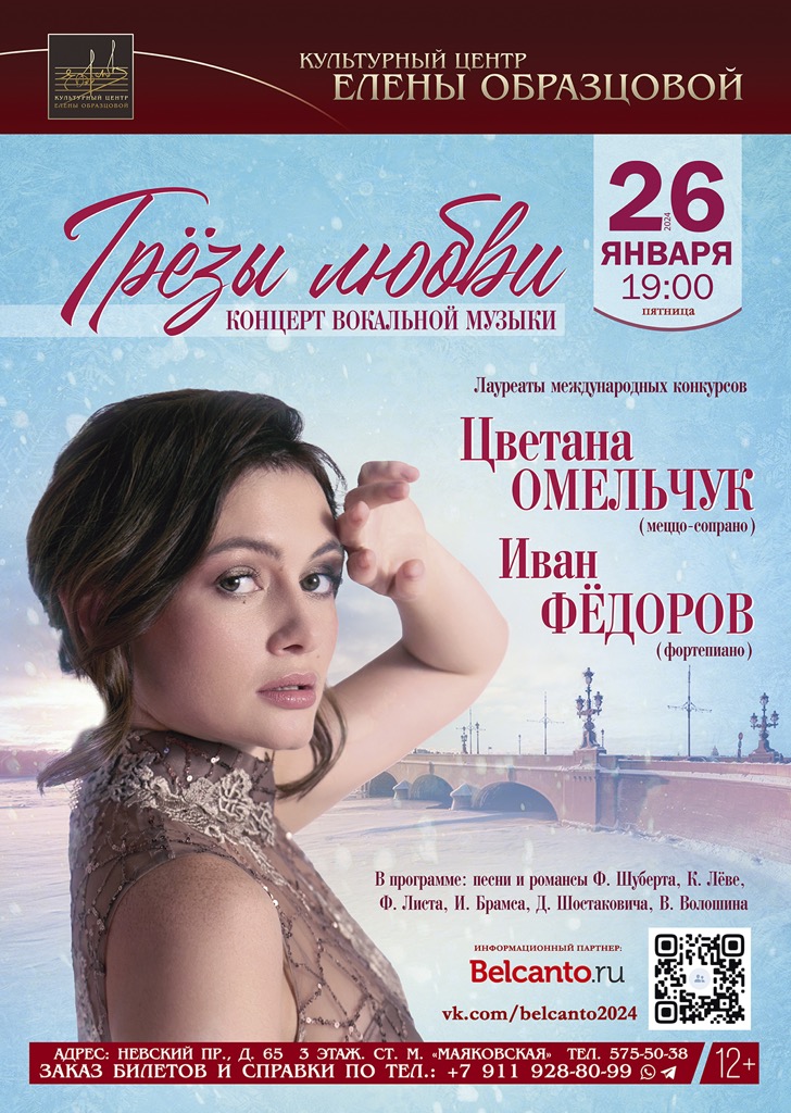 26 января (пятница) 2024 в 19:00 в зале Культурного центра Елены Образцовой в центре Санкт-Петербурга лауреаты международных конкурсов Цветана Омельчук (меццо-сопрано) и Иван Фёдоров (фортепиано) представят концертную программу «Грёзы любви», изюминой которой станет премьера вокального цикла современного российского композитора Владимира Волошина.