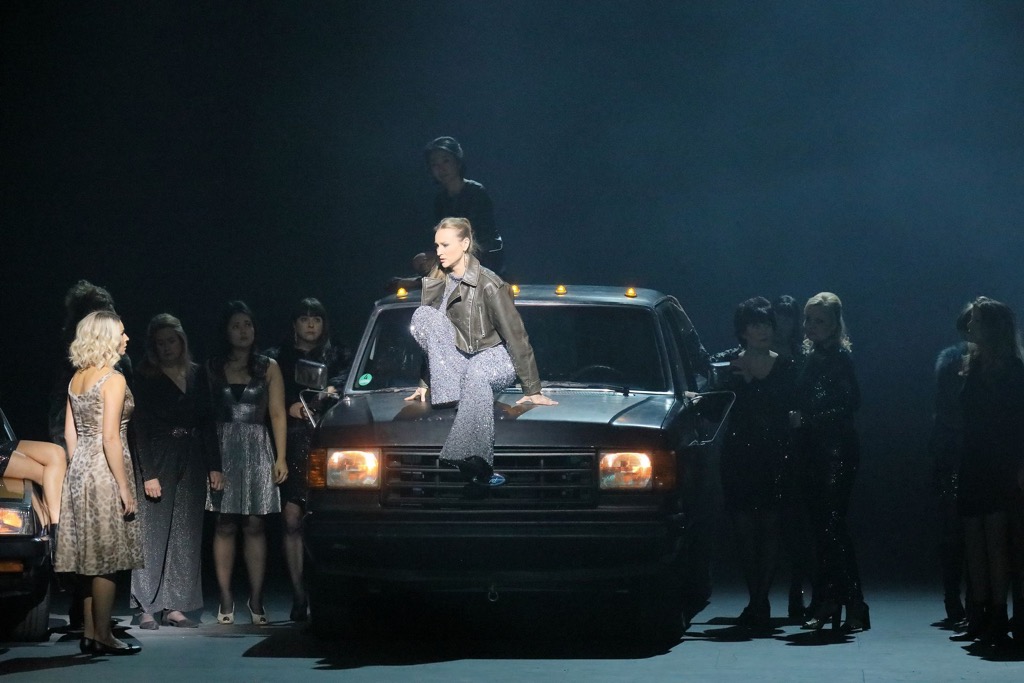 Например, круглый пруд, в котором Герман в неприемлемом исполнении Брэндона Йовановича топит какую-то девицу, которая, по-видимому, является двойником Графини в бесподобном исполнении Виолеты Урмана. Или вот ещё три ретромобиля появляются в сцене в комнате Лизы во время изумительного исполнения неотразимой Викторией Каркачёвой романса Полины, после которого женский хор, наряженный в проституток, пускается плясать по-русски, что вызывает в памяти Ленинградское шоссе в Москве конца 1990-х — начала нулевых, где девицы такого типа собирались и промышляли известно чем. Впрочем, уставшие костюмы из 1970-х (автор кутюрной усталости – Виктория Бэр) мешают и этому радостному «узнаванию»: очевидно, постановщики имели в виду эпоху ещё более унылую.