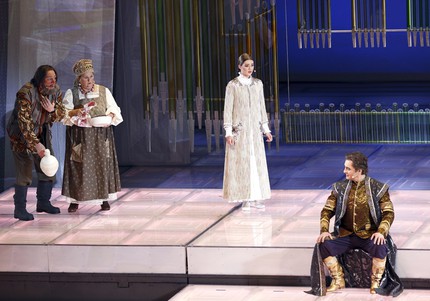 Пьесу-феерию Островского – масштабную конструкцию, изобилующую длиннотами и отвлекающуюся не на одну побочную линию, – с либретто большой пятиактной оперы мы сравнили вовсе не случайно. Если на премьере в XIX веке пьеса шла порядка пяти (!) часов, то в XXI веке, когда темпы и ритмы жизни невероятно ускорились, это просто немыслимо. И подобно тому, как Римский-Корсаков в своем либретто на основе пьесы Островского отсек «всё лишнее» и оставил главное, режиссер-постановщик обсуждаемой премьерной постановки Алексей Дубровский поступил точно так же. Главным для него, похоже, стало использование всей музыки Чайковского, которую он вписал во вполне самодостаточный драматургический остов – в квинтэссенцию пьесы Островского. И хотя в новой постановке (порядка трех часов с антрактом) есть персонажи, коими Римский-Корсаков поступился, ее драматургическая коллизия опере-наследнице практически идентична.