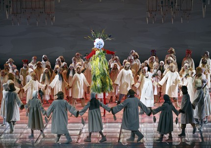 И костюмное, и хореографическое – с участием миманса – решение этой большой вокально-хоровой сцены (хореограф и режиссер по пластике – Виктория Арчая) настолько примитивно, что перенесение с Новой сцены Большого на детский утренник в районном Доме культуры зрителю, увы, обеспечено… При этом тот же самый художник-постановщик создает настолько примитивную абстрактную сценографию (говоря выше о студийности, именно это мы имели в виду), что вся постановка начинает ассоциироваться с откровенно бюджетным semi-stage проектом. С первого открытия занавеса мы попадаем в царство свисающих гирлянд из решеток, подозрительно смахивающих на систему органных труб со сплющенными соплами. Что тебе царство лесных обитателей, что тебе Берендеевка, что тебе царские покои, что заповедный лес, что, наконец, Ярилина долина – разницы никакой!