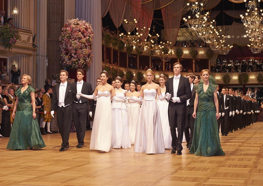 Одним из таких ритуалов является торжественное открытие бала фанфарной композицией в исполнении сценического оркестра Венской оперы, за которым следует государственный гимн Австрийской Республики [2], далее звучит гимн Евросоюза — фрагмент знаменитой «Оды к радости» из Девятой симфонии Бетховена, далее полонез, сопровождающий выход дебютантов от 180 до 200 пар.