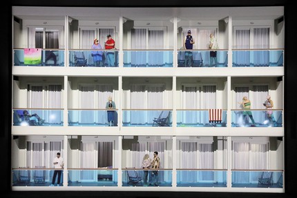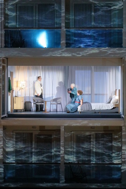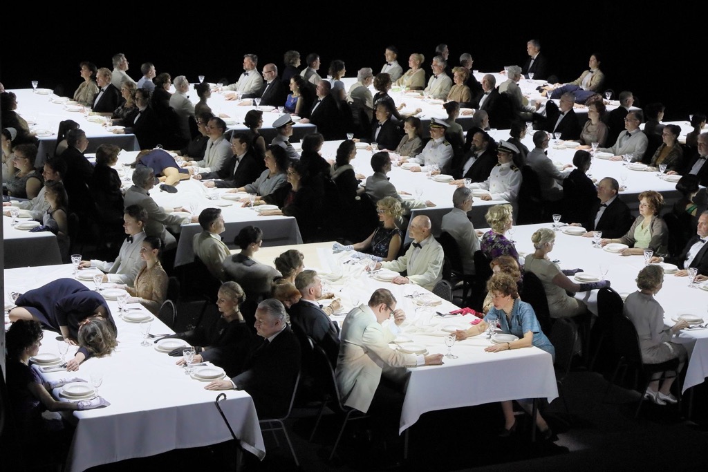 Прежде всего, в спектакле нет никакого Освенцима, и все сцены воспоминания о лагерной жизни разворачиваются на корабле: лагерные казармы превращены в длинные обеденные столы, вместо полосатых роб заключённых — полосатые полотенца на живописных балконах океанского лайнера (оформление Райнера Селльмайера), а вместо праздника у начальника концлагеря, во время которого гибнет жених Марты, мы видим невнятную попойку у капитана корабля. Попытка использовать систему двойников только усугубляет ситуацию.