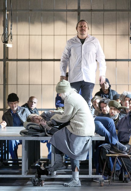 Но главным же испытанием должен стать поцелуй Кундри, который играет в этом прочтении совершенно удивительную роль: поцелуй настоящей страстной женщины возвращает уже почти бесполого гламурированного юнца к воспоминаниям о своей пацанской сущности, о своём тюремном прошлом, об Амфортасе (превосходная вокально-драматическая работа баритона Михаэля Наги), который так же потерял здесь своё мужское достоинство (копьё как фаллический символ).