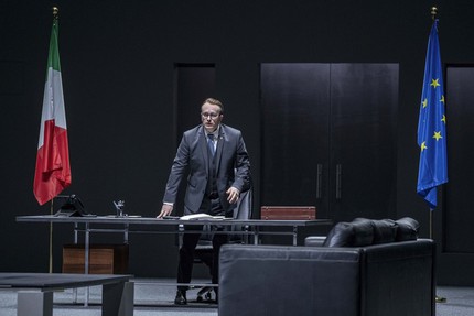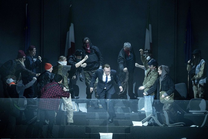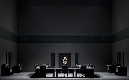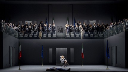 Как умный, а не просто талантливый режиссёр, Роберт Карсен, по-видимому, сознательно отказывается делать вид, что до него оперную придворную жизнь никто не инсценировал, и без стеснения использует концепцию своего коллеги Кристофа Лоя, создавшего удивительный административный триллер на базе лучшей оперы Гаэтано Доницетти «Роберто Деверё» (Мюнхен, 2005). Безликие современные правительственные учреждения, отличающиеся друг от друга только флагами и мелкой моторикой, и в самом деле хорошо оттеняют подлинную природу мышиной возни руководителей хоть мифических, хоть реальных. Единственным драмузлом в этих сюжетах становится конфликт между личными привязанностями руководителя и его административными обязанностями. В драматургическом развитии таких конфликтов решающее значение имеет финал.