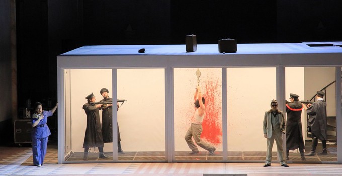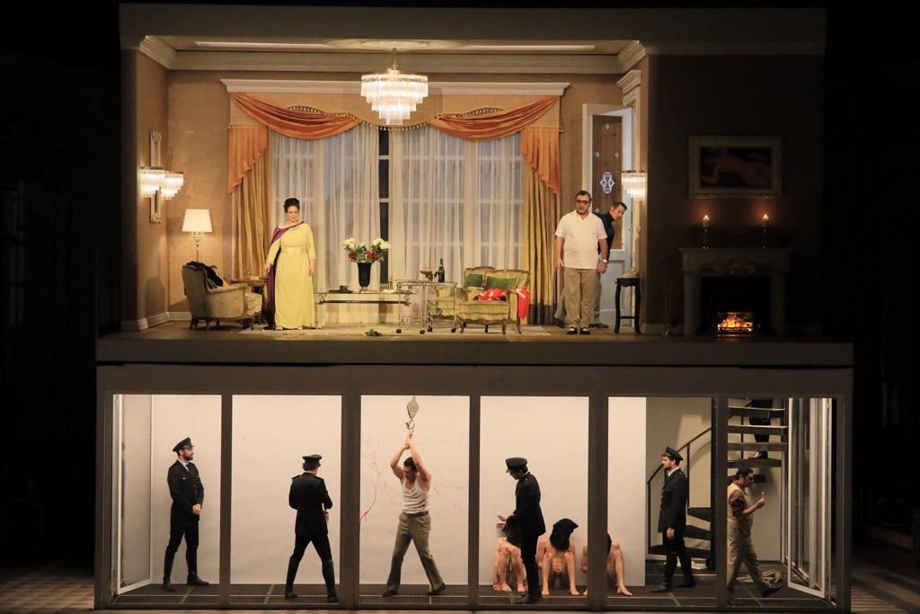 В роскошно оформленной сцене пыток (из-под сцены выплывает подвальный павильон в доме Скарпиа со связанными и истерзанными голыми коммунистами-трансвеститами, да ещё и кровища кругом — глаз не оторвать!) Корнель Мундруца зачем-то решает не только показать, как в пыточной обливают красной краской художника Каварадосси, а он визжит, как поросёнок (уже смешно, правда?), так ещё и сцену соблазнения фашиста Виттелио Скарпиа артисткой-коммунисткой Флорией разворачивает чуть ли не в полномасштабное стрип-шоу (впрочем, тут Пуччини сам виноват: у него в этой сцене музыки – девать некуда!).