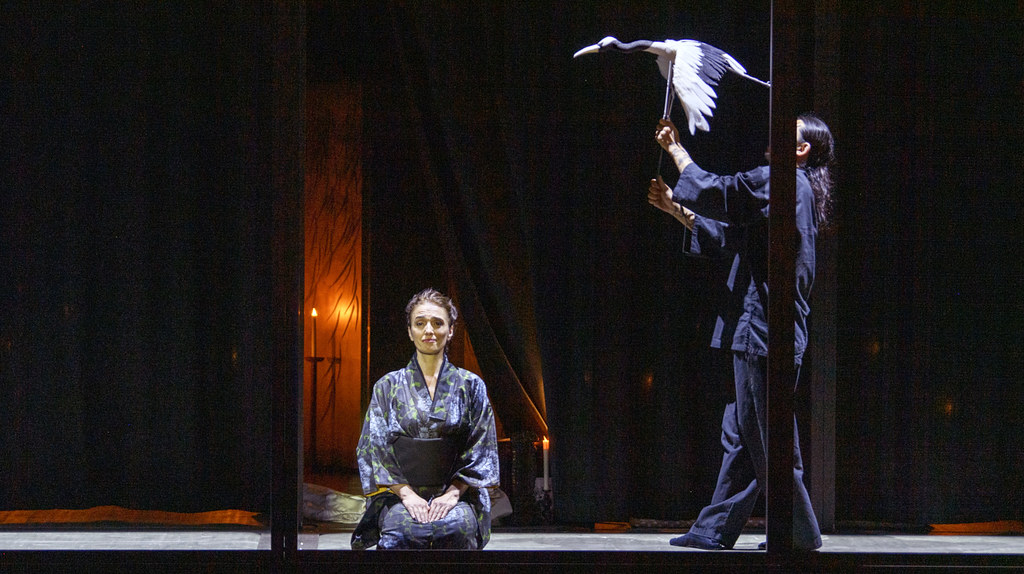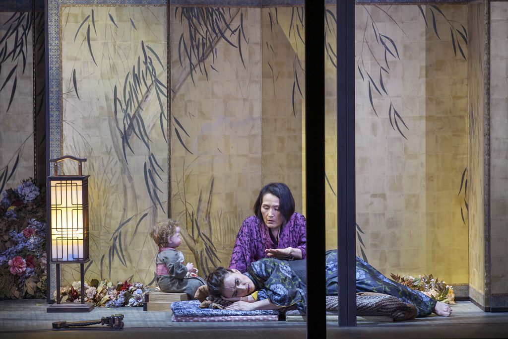 К слову, о нарциссизме Пинкертона: этой психиатрической нотки героя нет у Пуччини ни в тексте, ни в музыке. Эту «красочку» к образу негодяя-обманщика юных японок придумала бабушка олдскульной (старомодной то есть) феминистской стилистики режиссёрка (тут уж иначе не скажешь — прямо лыко в строку!) Андреа Брет. Эта любительница мелкой бесполезной моторики в мизансценах заставляет Пинкертона снимать носки и залезать одной ногой в таз, который ему приносит Судзуки (в изумительном исполнении японской меццо Михоко Фудзимура), вынуждает его во время представления слуг сватом Горо (в убедительно ироничном исполнении Карло Бози) вертеть в руках газету, и судя по тому, с какой скоростью певец её переворачивает и теребит, он и сам не понимает смысла этой эквилибристики с прессой. Словом, Брет старается проявить себя как соавтор, не сильно отступая от предписанного настоящими авторами либретто Дж. Джакозой и Л. Илликой.