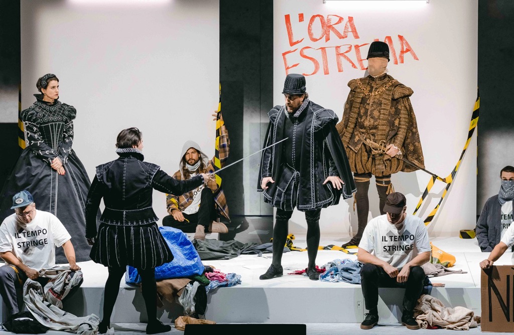 Во-вторых, с точки зрения непосредственного восприятия, конкретный спектакль Кирилла Серебренникова соприкасается с партитурой Верди лишь по касательной, и хотя зрителям подробно в текстовых видеопроекциях объясняют, кем были исторические личности, о которых идёт речь в опере, когда они жили, от чего умерли и чем знамениты, мы имеем дело с изменением места и времени событий, которые в оригинальном сюжете якобы происходили в 1568 при испанском дворе [3]. И если вы заранее не знакомы с режиссерской концепцией, у вас закономерно возникает ощущение, что вас обманули, что вам дали не тот продукт, за который вы заплатили.