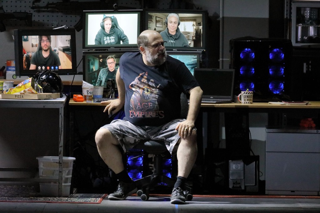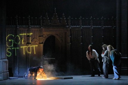 Далее, когда поднимается занавес, мы видим на сцене закрытую решетку храма. Сценография Райнера Зелльмаера прячет пространство сцены во мраке недосказанности, но помогает сориентироваться в эпохе узнаваемыми архитектурными элементами. В центре сцены высокая пирамидальная конструкция, напоминающая готический алтарь, вокруг неё четыре готических столба, на решётке надпись «Der Gott ist Tod» (Бог умер) [4]. На авансцене появляется пожилой обрюзгший человек в нелепой одежде неудачника, то есть в шортах-бермудах, майке и кроссовках (сандалий с носками явно не хватает). Он прикладывает пистолет к виску, потом под нижнюю челюсть и хочет застрелиться, но не может.
