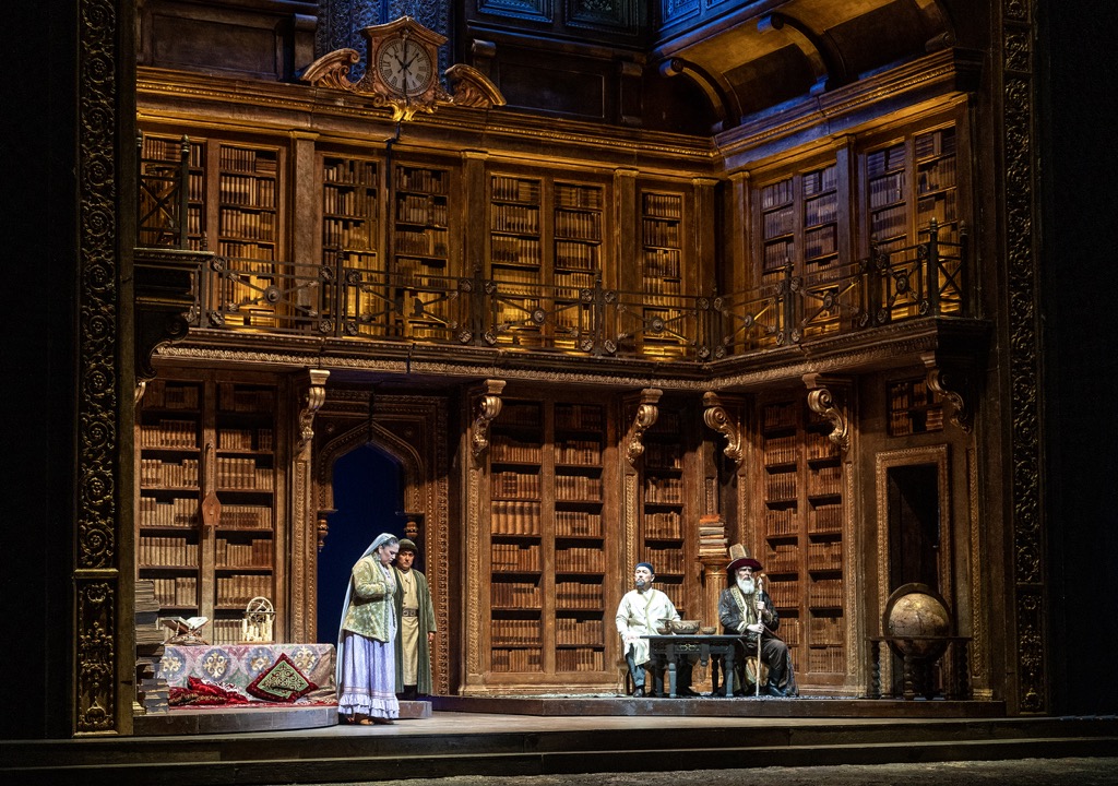 При этом абсолютно очевидно, что в расчете на достижение означенной «классической универсальности» в костюмно-сценографическом ракурсе пригласили именно этот широко известный в мире оперы дуэт художников-традиционалистов. Эцио Фриджерио и Франка Скуарчапино – истинные художники от театра. Они и вправду умеют делать красиво, и не просто красиво, а необычайно красиво – и даже гипертрофированно красиво в картине кабинета-библиотеки Абая – они сумели сделать и на этот раз! И это, кажется, главный козырь оригинально смелой сценографии, на который всегда (и на сей раз тоже) обращают внимание в рекламных анонсах: «Кабинет Абая наглядно раскрывает многогранный мир поэта: блистающая золотом книг библиотека, глобус, армилляр (армиллярная сфера: прим. моё – И.К.), бюсты великих философов… А двери кабинета распахиваются прямо в огромный мир!» И эта картина действительно завораживает космосом просвещенности!