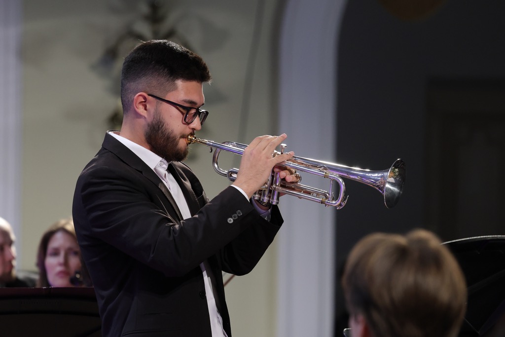 Но обо всём – по порядку, но не в порядке услышанного, а по каждому из названных выше разделов. В оркестрово-инструментальной части прозвучали увертюра к «Руслану и Людмиле» Глинки, «Вальс-каприс» Рубинштейна, «Три чуда» и «Пляска скоморохов» из опер Римского-Корсакова «Сказка о царе Салтане» и «Снегурочка», «Вальс-скерцо» для скрипки с оркестром Чайковского (соло на скрипке – Даниил Коган), «Тройка» из цикла музыкальных иллюстраций Свиридова к повести Пушкина «Метель», а также «Восточная мелодия» Кюи с аккомпанементом фортепиано (соло на трубе – Асадбек Аликулов).