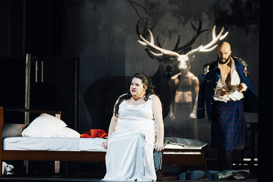 Я искренне не понимаю, зачем заставлять женщину, обладающую специфически объёмной внешностью, раздеваться до ночнушки, укладываться на кровать на спину и раздвигать перед зрителями ноги с целью привлечь вернувшегося с войны мужа. От потрясения, неизмеримо более страшного, чем вокал певицы, зрителей избавляет Макбет, бросающийся между раздвигающихся ног своей супруги, как герой на амбразуру.