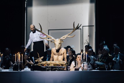 Включение в видеоряд провоцирующего своими неуместными обобщениями женского образа коллективного разума вызывает в зале недовольные комментарии прямо во время спектакля. Впрочем, к подобным же нелепым провокациям можно отнести и появление на сцене голого статиста в образе человека-оленя, а утомительные цитаты из Макиавелли и других полит-мудрецов, появляющиеся в морских видеозаставках между сценами и ничего не проясняющие ни в сюжете Шекспира, ни в опере Верди, ни в спектакле самой Синьроль, вызывают серьёзные вопросы к профпригодности режиссёра.
