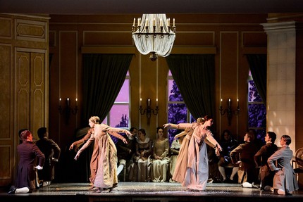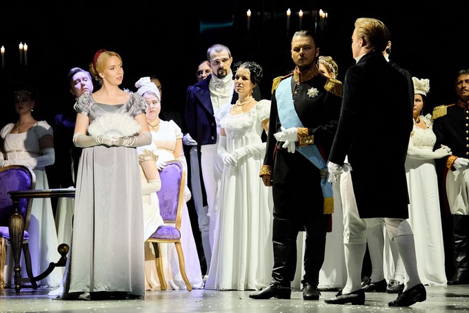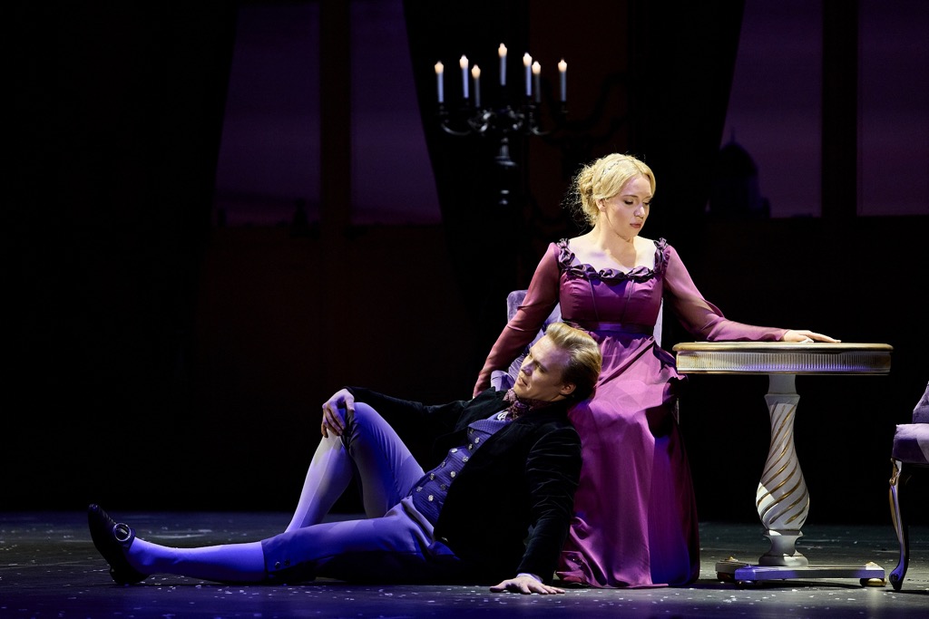 Авторами увлекательной игры в оперу (одиннадцатой постановки в этом театре) вместе с режиссером Сергеем Новиковым стали сценограф Александр Купалян, художник по костюмам Мария Высотская, художники Руслан Майоров (свет) и Дмитрий Иванченко (видео), а также балетмейстер Леонид Сычев, и оптимистичное послевкусие, оставшееся от просмотра, говорит о том, что даже при таком кардинальном режиссерском вираже романтическая эстетика оперного театра в тиски произвола не зажата. Режиссер прочитал роман Пушкина по-особому досконально – что называется, с пристрастием. И поэтому действие оперы по сюжету романа, отсылающего к первой четверти XIX века, он легким движением руки перенес на стык XVIII и XIX веков, и эта манипуляция понадобилась ему для того, чтобы по-новому закрутить интригу ссоры Онегина и Ленского на балу у Лариных.