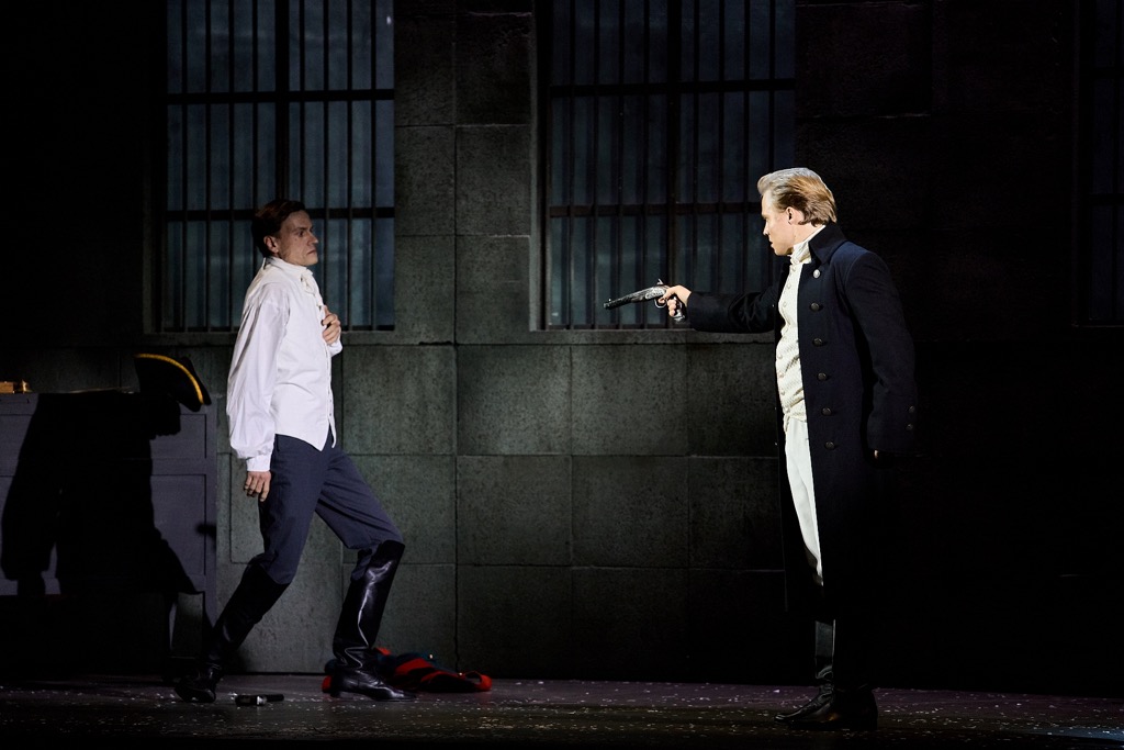 Такое вот кино, по классическому сценографическому антуражу очень напоминающее третий акт «Тоски» Пуччини, в котором подле Тюремщика (на этот раз в его ипостаси – Зарецкий) Марио Каварадосси пишет прощальное письмо своей возлюбленной. При этом отсутствие четвертого (бессловесного) персонажа картины месье Гильо ловко обыгрывается мизансценой Зарецкого и Онегина с настольной гильотиной (устройством для отрезания «колпачка» сигар), а Зарецкий, ни в чём не повинный на первый взгляд, легко и без подставления под удар репутации Онегина приносится режиссером в жертву, ибо в события оперы через события романа стихах Пушкина на этот раз вторгается сама жизнь.