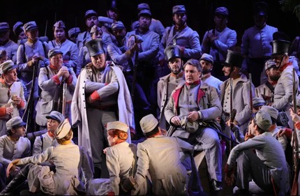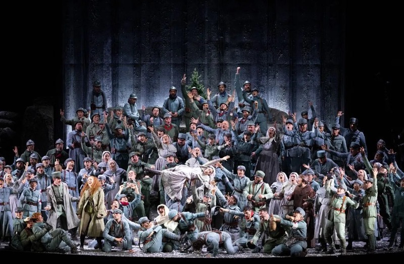 Ну и, наконец, о постановке. Режиссёр спектакля Лео Мускато и его команда создали трёхслойный пирог из эпох XIX, XX и XXI веков на огромном вращающемся планшете (сценограф Федерика Паролини). Милитаризм хоровых сцен выглядел несуразным, взаимодействия массовки смешили в самых неожиданных местах, солисты были предоставлены самим себе. Радовали многосоставные костюмы Сильвии Аймонино и светомузыка Алессандро Верацци. Всё остальное напоминало сельскую самодеятельность, к которой сегодня можно без преувеличения отнести весь итальянский оперный мейнстрим.