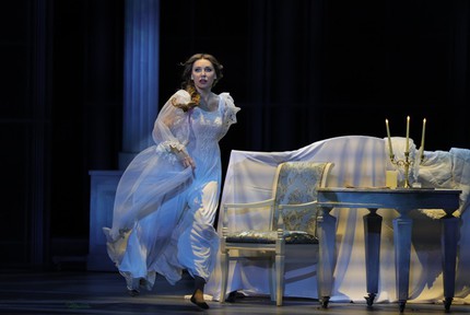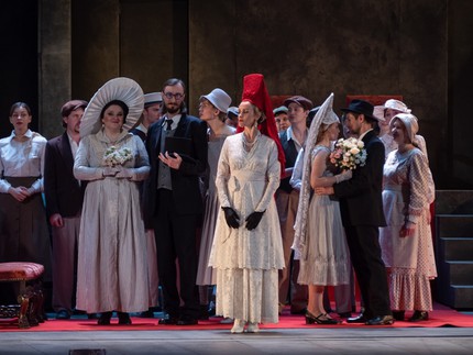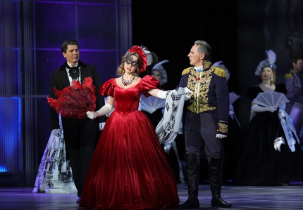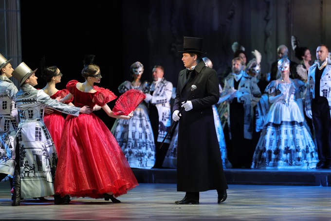 Мир архетипов стал миром интеллектуальной игры, и, по словам режиссера, «“тот” мир проступает водяными знаками сквозь нашу повседневность, он здесь, он неизменен и извечен – стóит просто присмотреться», но это то, с чего мы и начали наш экскурс по новой постановке. Стóит также присмотреться к мизансценам, рельефность и динамика которых увлекают в воронку потаенных смыслов и жизненных ситуаций. Стóит присмотреться и к ларинскому балу – впечатляющей энциклопедии русского костюма той эпохи: после этой (центральной) картины оперы с гениально додуманной Чайковским сценой ссоры Онегина и Ленского наступает необратимый перелом, что в постановке закономерно проявляется и в сценографии, в и мизансценах, и в костюмном антураже петербургского бала.